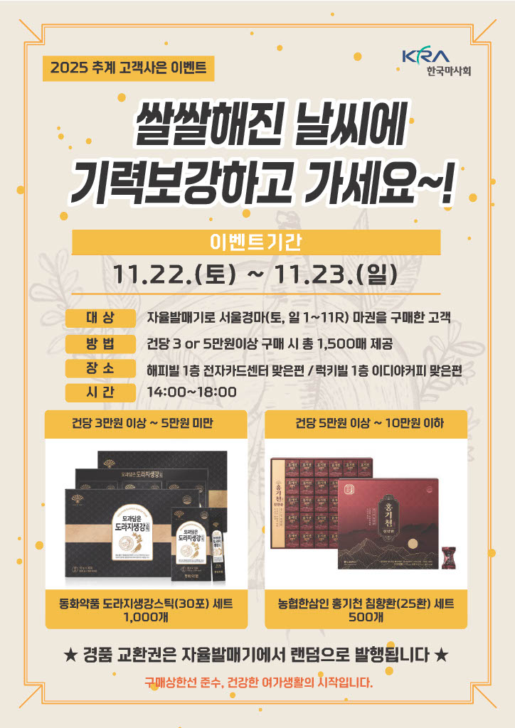 이벤트 서울경마공원 추계 고객사은 발매이벤트 작성자 : 발매운영부 작성일 : 2025-11-19 ★ 11.22.(토) ~ 11.23.(일) ★ 서울경마공원 추계 고객사은 발매이벤트를 시행하오니 많은 참여 부탁드립니다. 이전글 렛츠런파크 10월 캘린더 다음글 (부경) 첫 방문의 설렘, 부경경마공원에서 시작하세요!