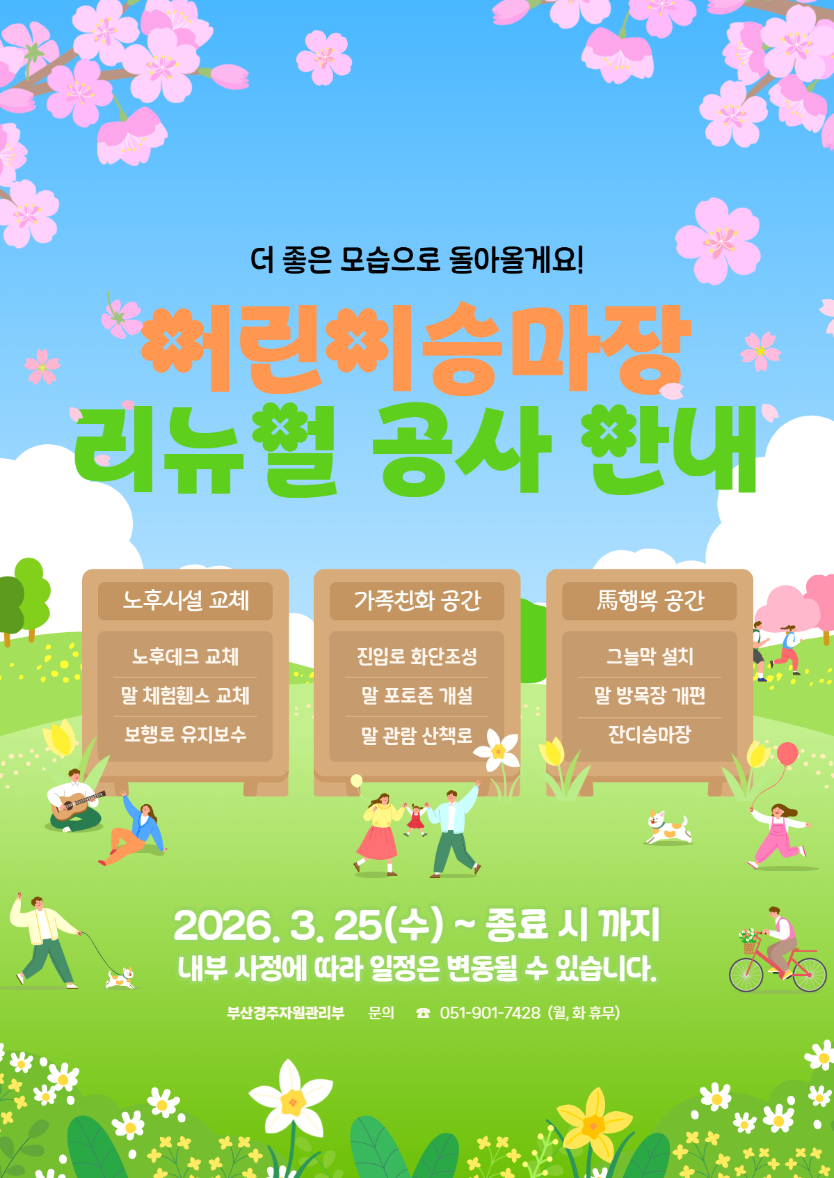 공지사항 [부경] 어린이승마장 운영중단(리뉴얼 공사) 안내 작성자 : 부산경주자원관리부 작성일 : 2026-03-15 이전글 4월 평일환급 및 계좌업무 운영시간 안내 다음글 [제주] 상반기 파크골프 초보교실 교육 참가자 모집