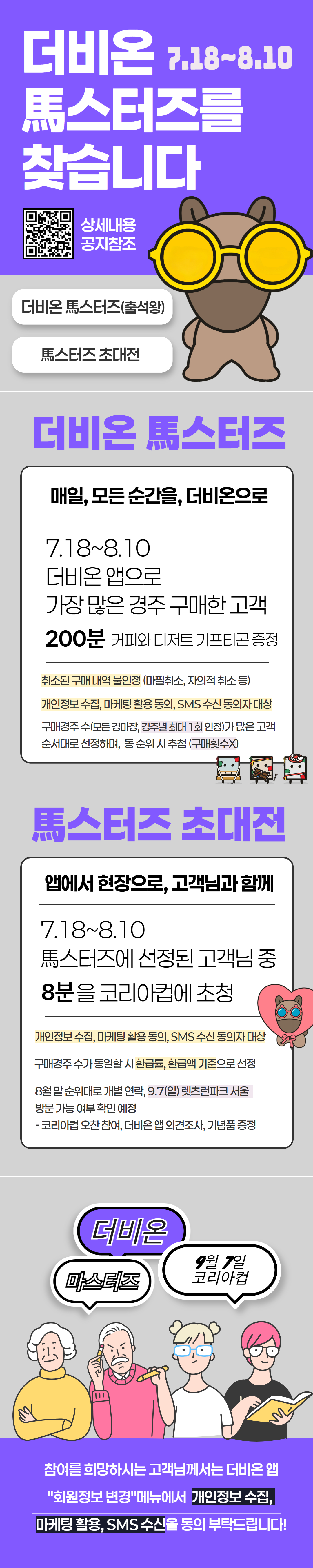 이벤트 더비온 馬스터즈 이벤트 (7.18~8.10) 작성자 : 온라인사업부 작성일 : 2025-07-06 이전글 6월 21일 말죽거리마켓 미운영 안내 다음글 [서울] 여름맞이 고객사은 발매이벤트 시행 안내(7.19.(토)~7.20.(일))