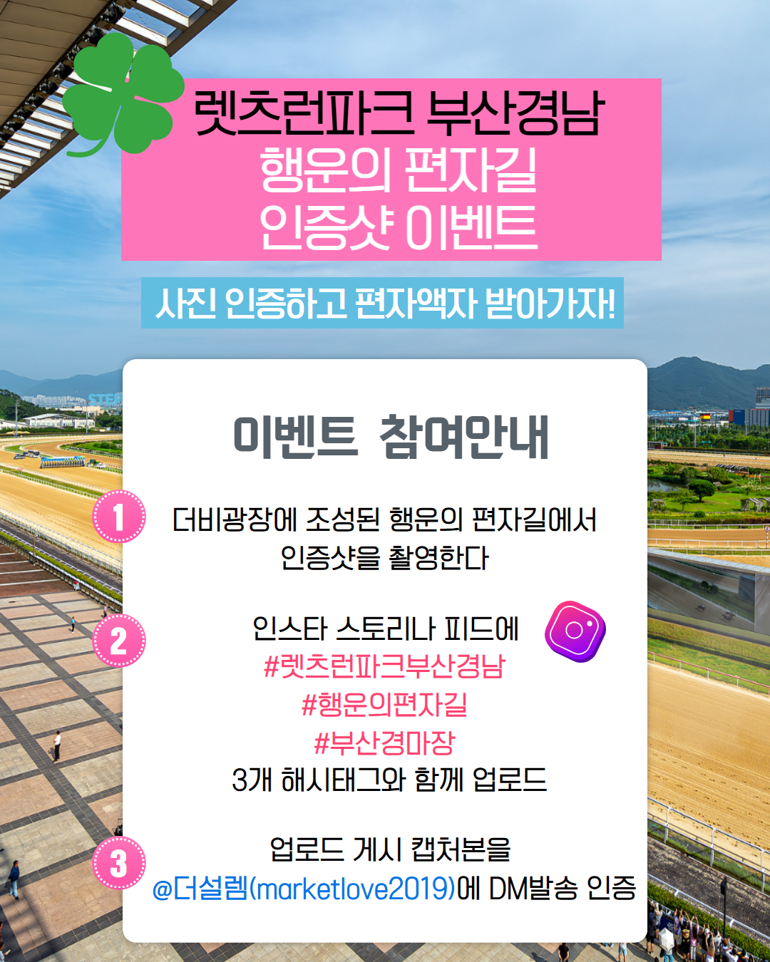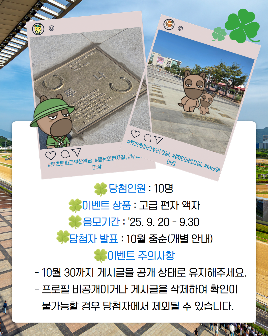 이벤트 (부경) 행운의 편자길 조성 기념 인증샷 이벤트 작성자 : 부산운영지원부 작성일 : 2025-09-20 이전글 건전경마 서약 및 퀴즈 온라인 이벤트(9.19.~10.2.) 다음글 (부경) 제19회 경상남도지사배 기념 부산경남경마공원 무료입장(10. 26.(일)