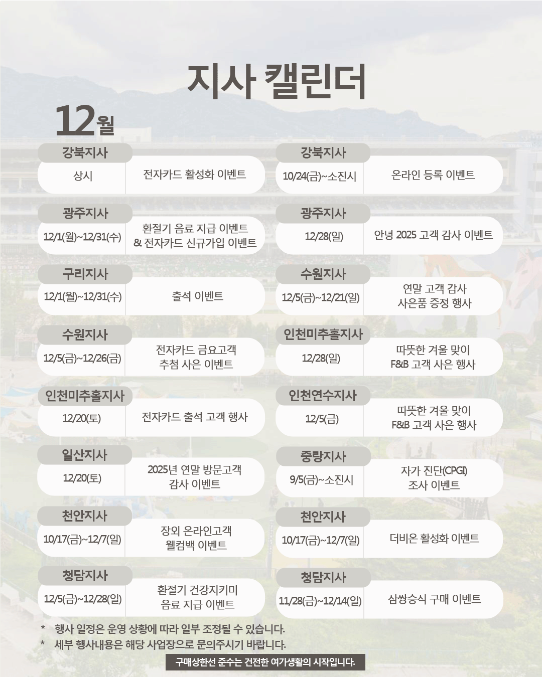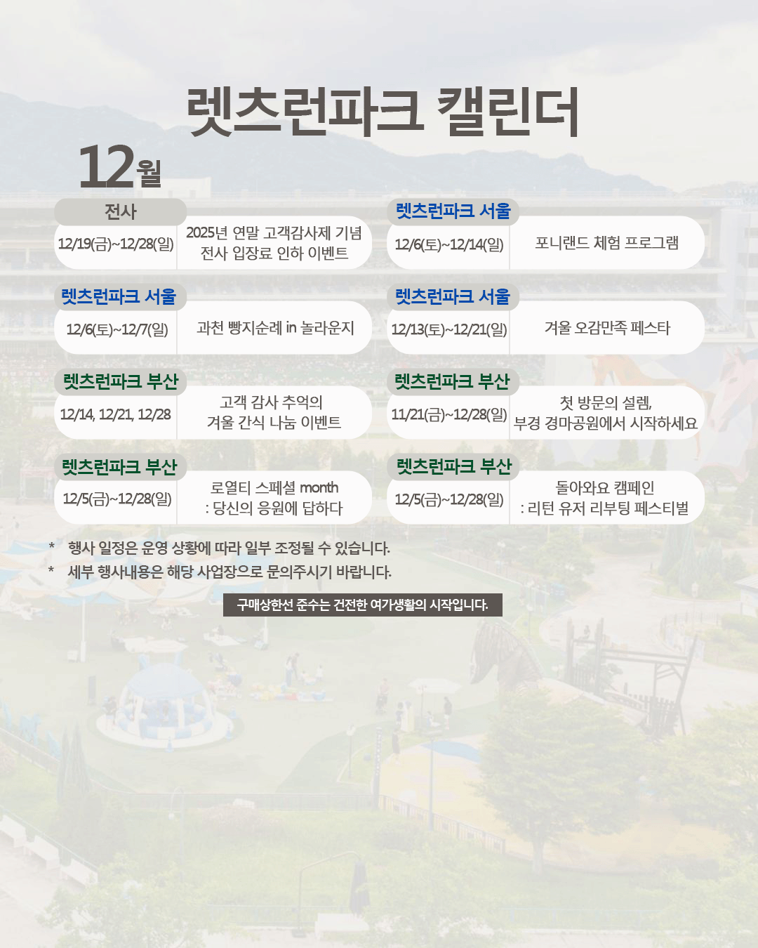 공지사항 렛츠런파크 12월 캘린더 작성자 : CS마케팅부 작성일 : 2025-12-04 이전글 [서울] 12월 1~2주차 금요일 무료입장 행사 다음글 렛츠런파크 서울 포니랜드 12월 포니체험 안내