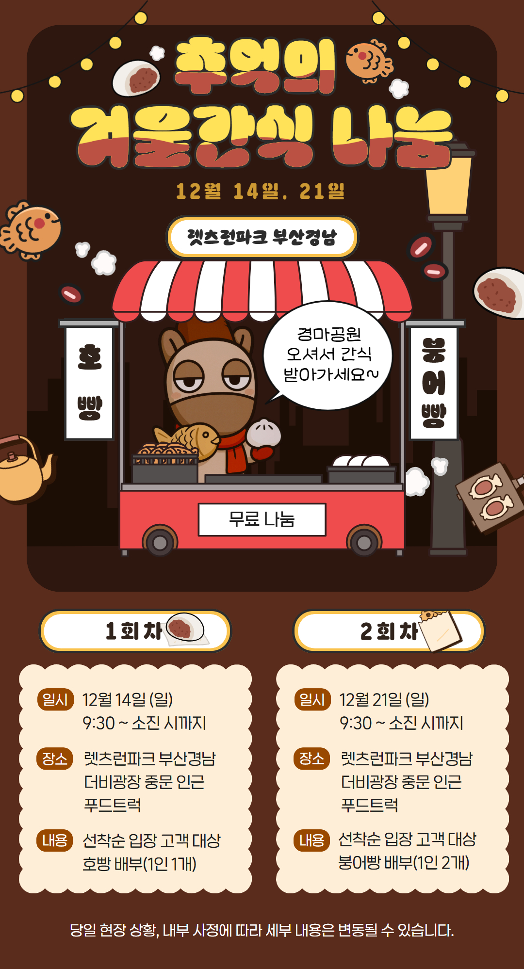 공지사항 [부경] 추억의 겨울간식 나눔 이벤트(12.14,12.21) 작성자 : 부산고객안전부 작성일 : 2025-12-05 ▶렛츠런파크부경 추억의 겨울간식 나눔이벤트◀ 12월 14일, 21일 양일 간 부산경남경마공원 입장고객 분들께 따뜻한 겨울간식을 나눔해드립니다. 입장시작 시간(9:30)부터 소진 시까지 진행되오니 많은 관심 부탁드립니다♡ 이전글 렛츠런파크 서울 럭키빌 4층 좌석 교체 안내 다음글