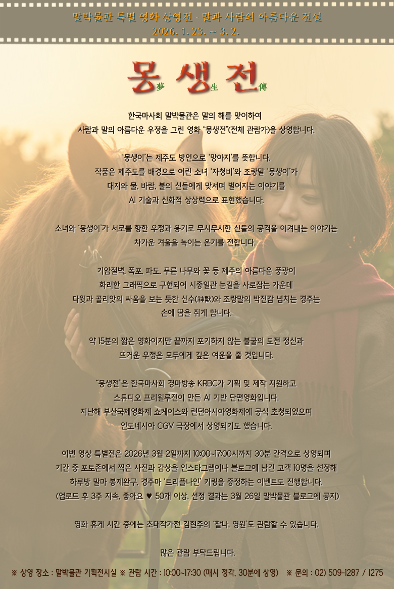 ※ 상영 장소 : 말박물관 기획전시실 ※ 관람 시간 : 10:00~17:30 (매시 정각, 30분에 상영)