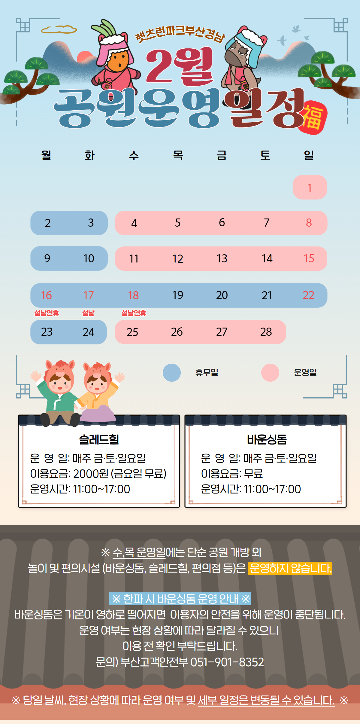 ! 2월16일~2월 24일은 설연휴를 포함하여 공원 휴무일입니다 !